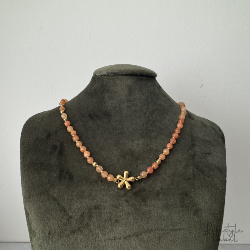 Deze prachtige kralen ketting straalt veel warmte uit door de kleur. Gemaatk van terra/oranje kleurige kralen met een goud detail een bloem hanger. Een stijlvolle accesoire die jou outfit compleet maakt.