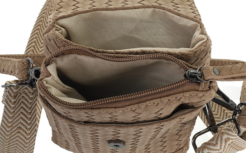 Dankzij de twee meegeleverde schouderbanden kan de tas op verschillende manieren gedragen worden: een brede, grafische webbing strap voor een sportieve look en een smalle PU-band voor een klassieke, elegante uitstraling. Het hoogwaardige gevlochten PU-materiaal in bruin geeft de tas een luxe gevoel, terwijl de ritssluiting en magneetsluiting zorgen voor veilige opbergruimte.