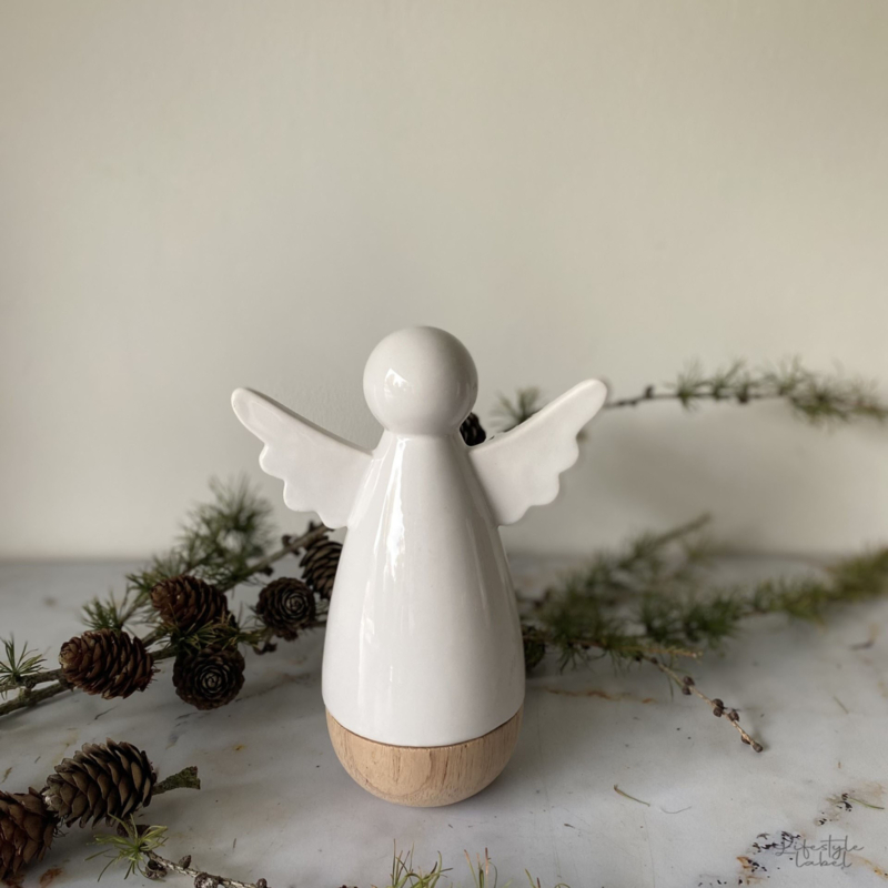 Deze mooie wit keramiek engelen zijn leuk om toe te voegen aan jouw interieur. Maak met de decembermaand een heerlijk sfeer in huis. Deze mooie engelen zijn in twee verschillende maten te bestellen en zijn gemaakt van kermiek in combinatie met een naturel houten rand. Decoreer deze engelen in jouw interieur tussen de ander kerstaccessoires.